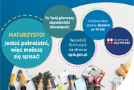 Matura jest egzaminem dojrzałości, po zdaniu którego można wejść w dorosłe życie. Jej wyniki będą decydować o Waszej przyszłości - dalszej edukacji lub zawodzie. Po ukończeniu 18 lat stajecie się dorośli, macie swoje prawa i obowiązki jako obywatele. Jednym z nich jest udział w Narodowym Spisie Powszechnym Ludności i Mieszkań. Dzięki uczestnictwu w spisie nie tylko macie możliwość potwierdzenia swojej dojrzałości obywatelskiej, ale również bezpośrednio wpływacie na obraz współczesnego młodego pokolenia, pokazując jego stosunek do narodowości, wyznania, czy niepełnosprawności. Poprzez samospis na stronie https://spis.gov.pl/ możecie współuczestniczyć w tym badaniu na własnych warunkach, pamiętając że liczy się każdy.