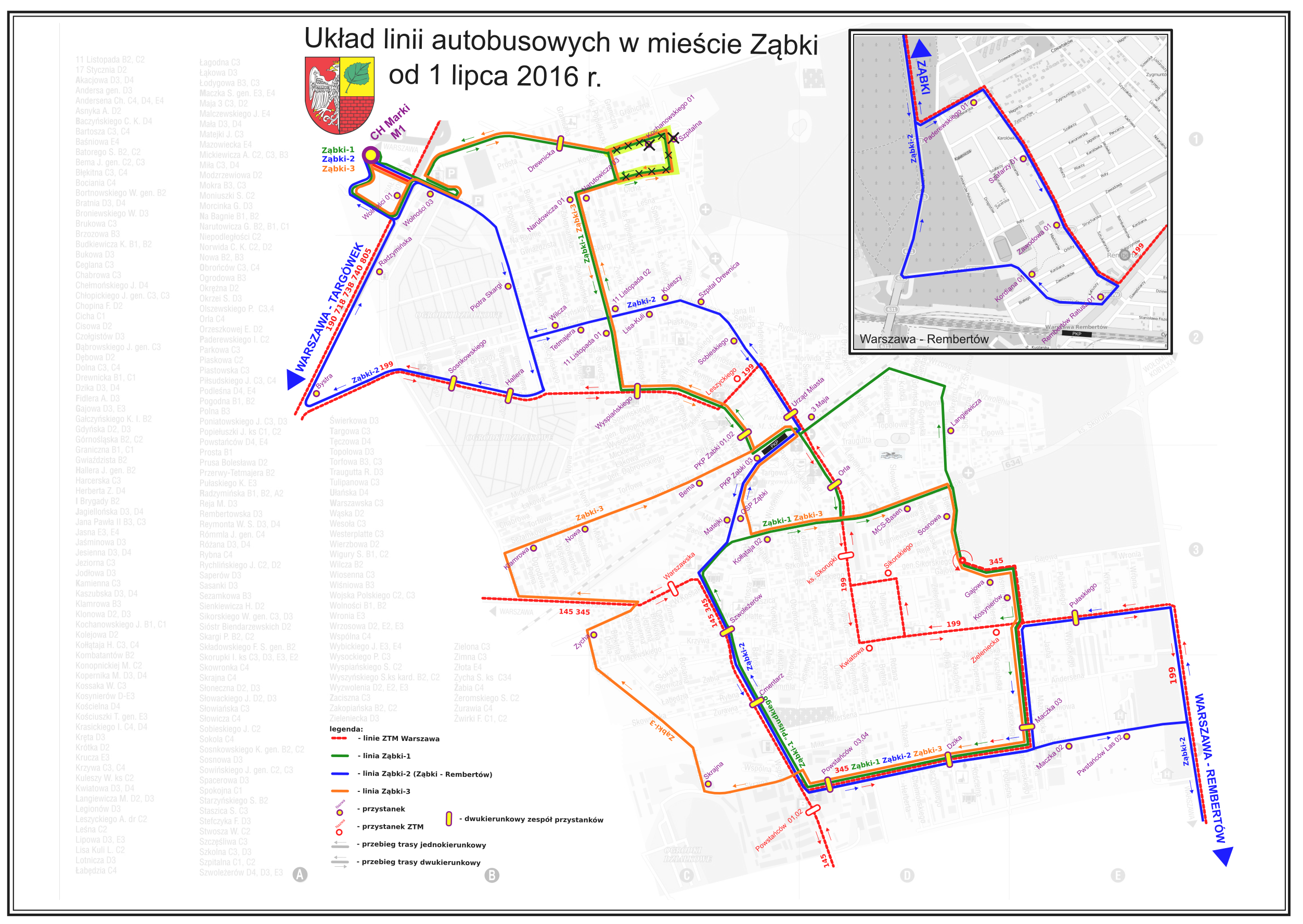 Mapa układu linii komunikacji miejskiej na terenie Ząbek po 1 lipca 2016 r.