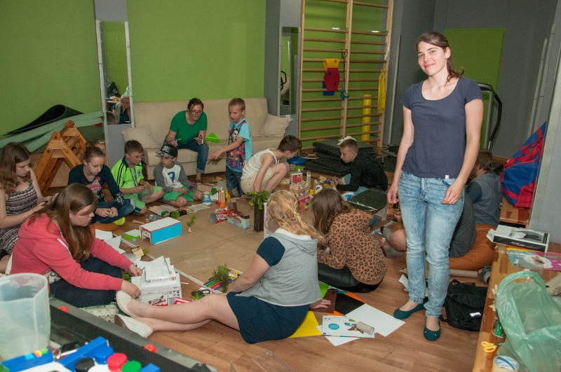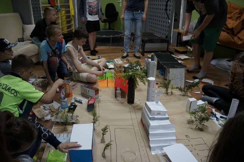 W drugiej części warsztatów dzieci mogły wykorzystać nowo zdobyte wiadomości w praktyce. Pod okiem prowadzącej i wychowawców świetlicy wspólnie zaprojektowały miasto i zbudowały sporych rozmiarów makietę z zebranych wcześniej pudełek i opakowań po produktach spożywczych.