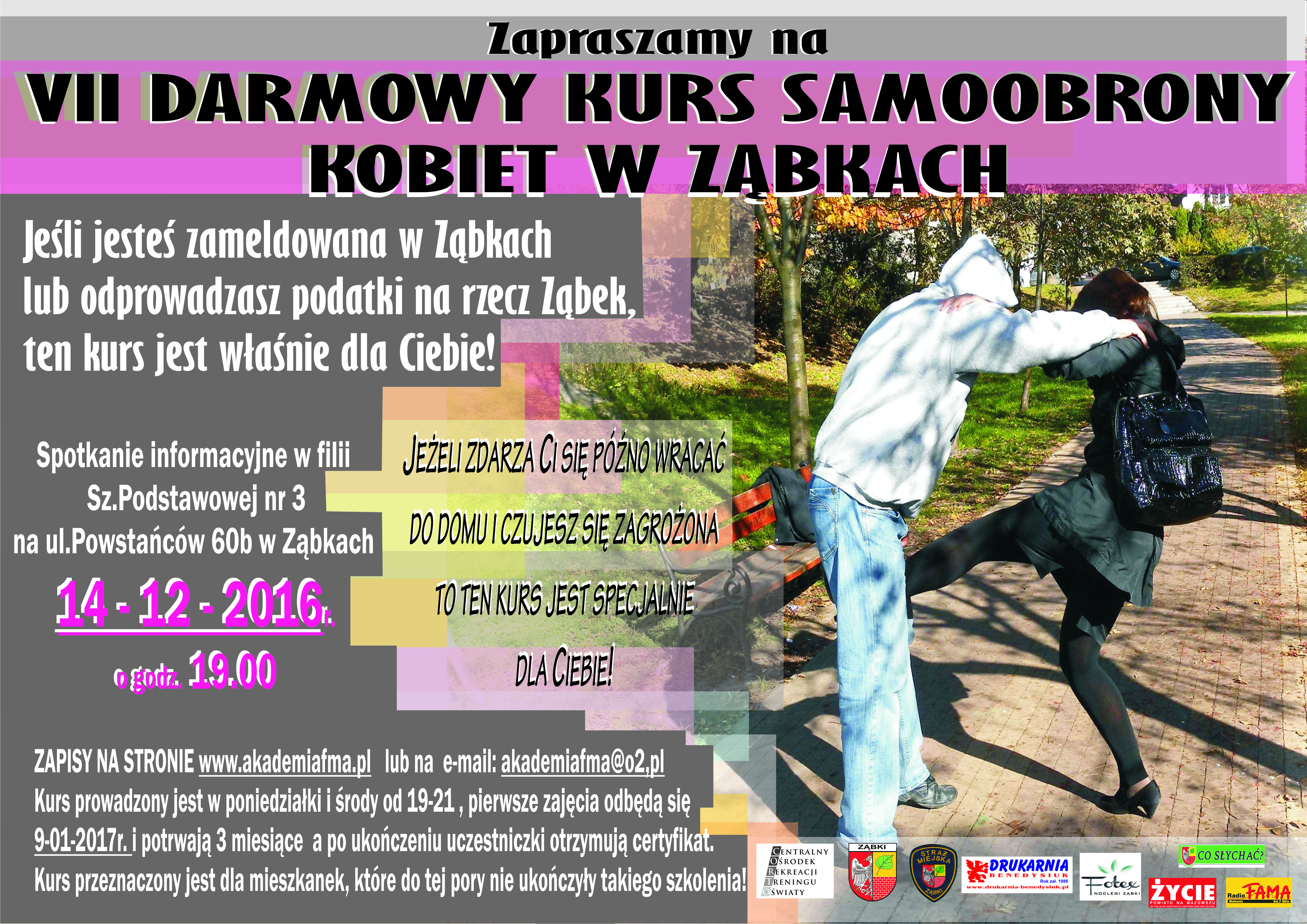 Zapisy na stronie www.akademiafma.pl lub na e-mail: akademiafma@o2.pl . Kurs prowadzony będzie w poniedziałki i w środy w godz. 19.00 – 21.00 . Pierwsze zajęcia odbędą się 9 stycznia 2017 r. i potrwają do 5 kwietnia 2017 r., przez 3 miesiące. Po ukończeniu, uczestniczki otrzymują certyfikat. Kurs jest przeznaczony dla mieszkanek Ząbek, które do tej pory nie ukończyły takiego szkolenia.