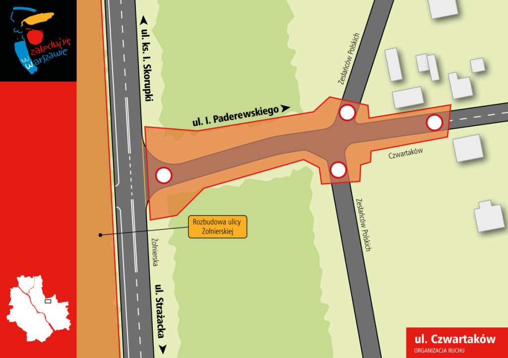 17 marca ok. godz. 22 zostanie wyłączona z ruchu ul. Czwartaków (w Rembertowie) od Żołnierskiej do skrzyżowania z Zesłańców Polskich wraz ze skrzyżowaniem. Objazd poprowadzony będzie Strażacką, Chruściela „Montera” i Paderewskiego. Na ul. Kordiana i Zawiszaków wprowadzone zostanie ograniczenie tonażowe do 3,5 t. Ma ono na celu wyeliminowanie ruchu samochodów ciężarowych, które tymi ulicami mogłyby skracać objazd do ul. Strażackiej. Taka organizacja ruchu będzie obowiązywała do 7 kwietnia. W tym czasie położona zostanie nawierzchnia bitumiczna na jezdni ul. Czwartaków i na łącznicach węzła. Następnie ruch zostanie przełożony na nowe łącznice, a zamknięta będzie jezdnia główna ul. Żołnierskiej. Wykonawca przystąpi do jej rozbiórki i prac związanych z budową wiaduktu.