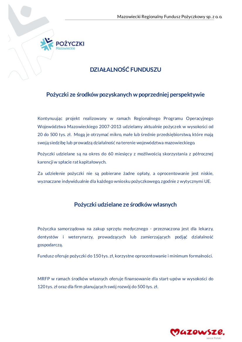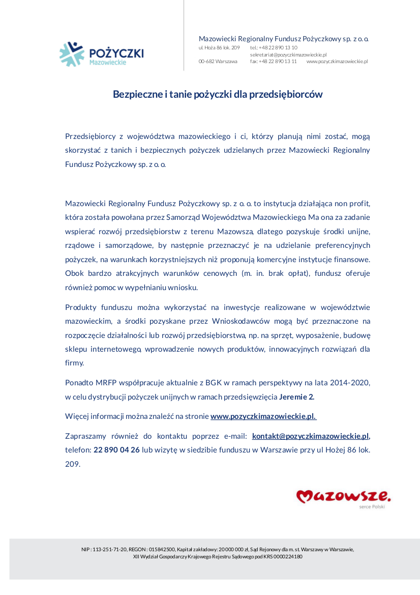 Mazowiecki Regionalny Fundusz Pożyczkowy sp. z o.o. zaprasza przedsiębiorców do skorzystania z bezpiecznych i tanich pożyczek.