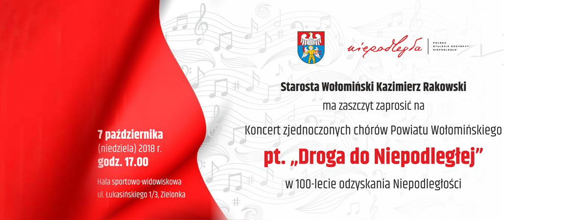 Szanowni Państwo, Starosta Wołomiński Kazimierz Rakowski serdecznie zaprasza na Koncert zjednoczonych chórów z Powiatu Wołomińskiego pt. „Droga do Niepodległości” w 100-lecie odzyskania przez Polskę Niepodległości. Koncert odbędzie się 7 października br. (niedziela) godz. 17.00 w hali sportowo-widowiskowej ul. Łukasińskiego 1/3, Zielonka. Zapraszamy na koncert z rodzinami aby uczcić święto Niepodległości.