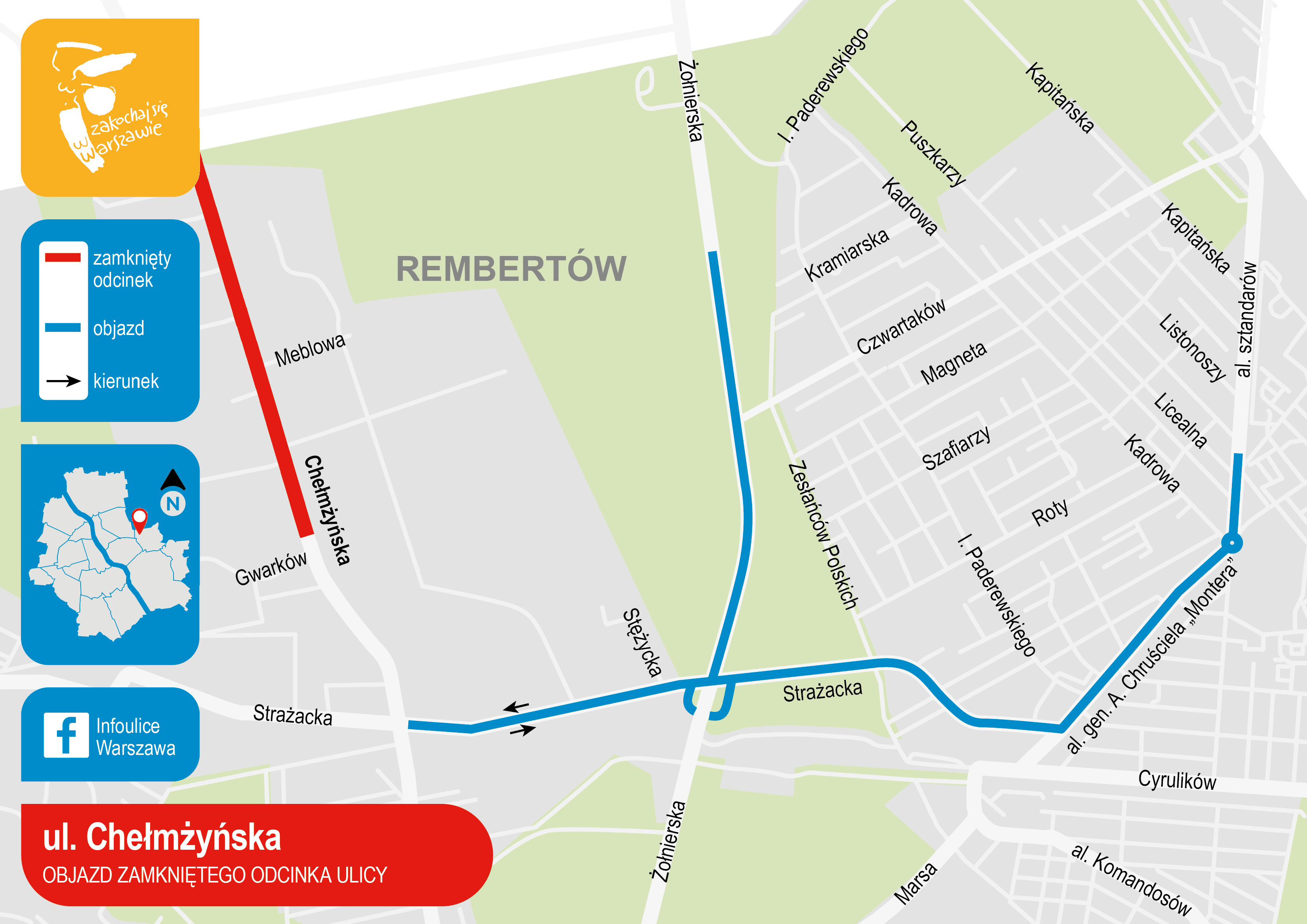 W związku z rozpoczęciem naprawy nawierzchni jezdni ul. Chełmżyńskiej, a tym samym zamknięciem jej dla ruchu kołowego na odcinku Powstańców – Strażacka, od dnia 20.06.2020 r. od początku kursowania do dnia 21.06.2020 r. do końca kursowania, linia autobusowa 145 zostaje – od ronda skrzyżowaniu ulic Piłsudskiego/Powstańców w Ząbkach – skierowana (w obu kierunkach) na następującą trasę objazdową: