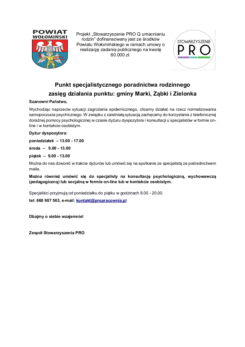 Punkt specjalistycznego poradnictwa rodzinnego zasięg działania punktu: gminy Marki, Ząbki, Zielonka.