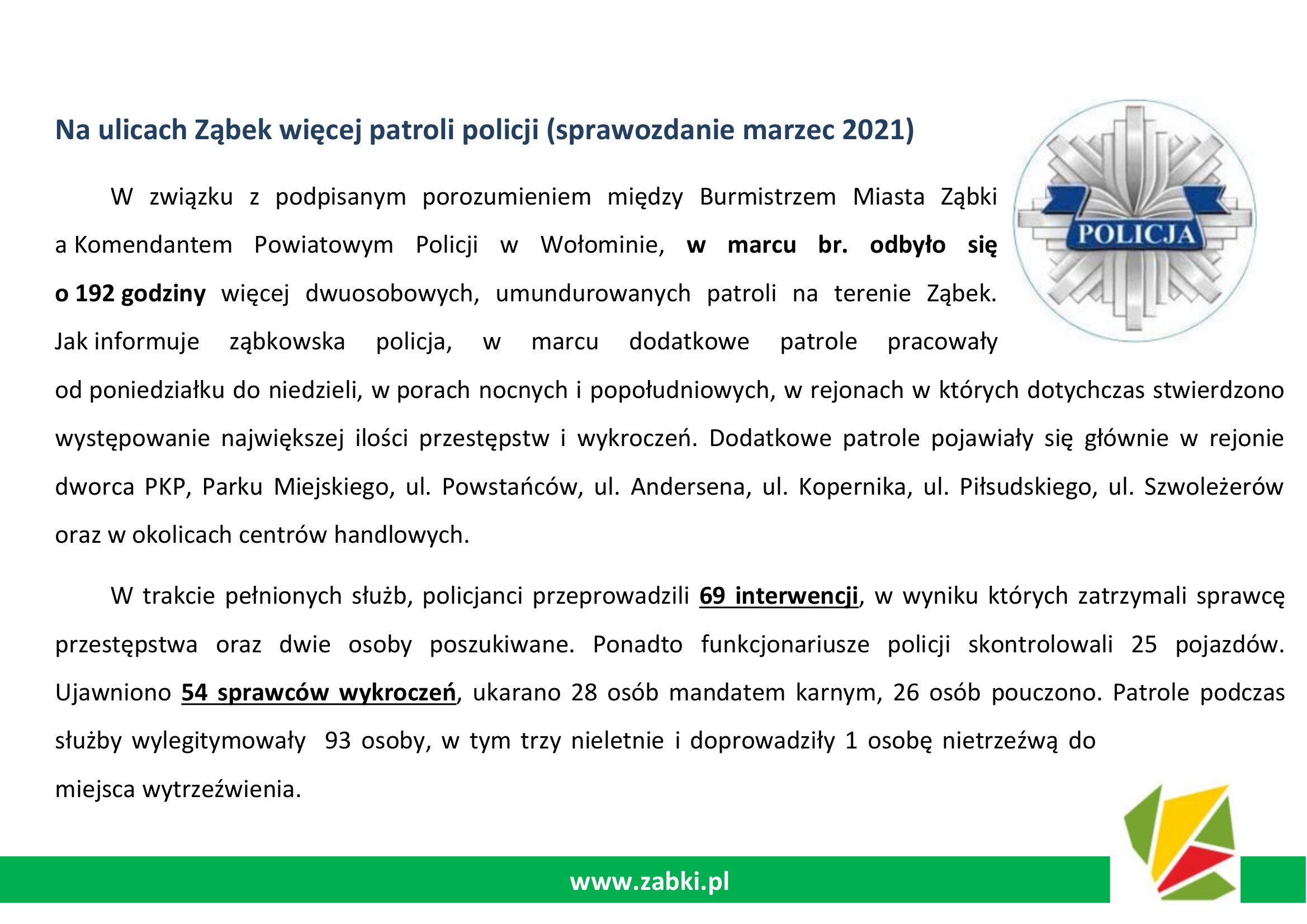 W związku z podpisanym porozumieniem między Burmistrzem Miasta Ząbki a Komendantem Powiatowym Policji w Wołominie, w marcu br. odbyło się o 192 godziny więcej dwuosobowych, umundurowanych patroli na terenie Ząbek. Jak informuje ząbkowska policja, w marcu dodatkowe patrole pracowały od poniedziałku do niedzieli, w porach nocnych i popołudniowych, w rejonach w których dotychczas stwierdzono występowanie największej ilości przestępstw i wykroczeń. Dodatkowe patrole pojawiały się głównie w rejonie dworca PKP, Parku Miejskiego, ul. Powstańców, ul. Andersena, ul. Kopernika, ul. Piłsudskiego, ul. Szwoleżerów oraz w okolicach centrów handlowych.
