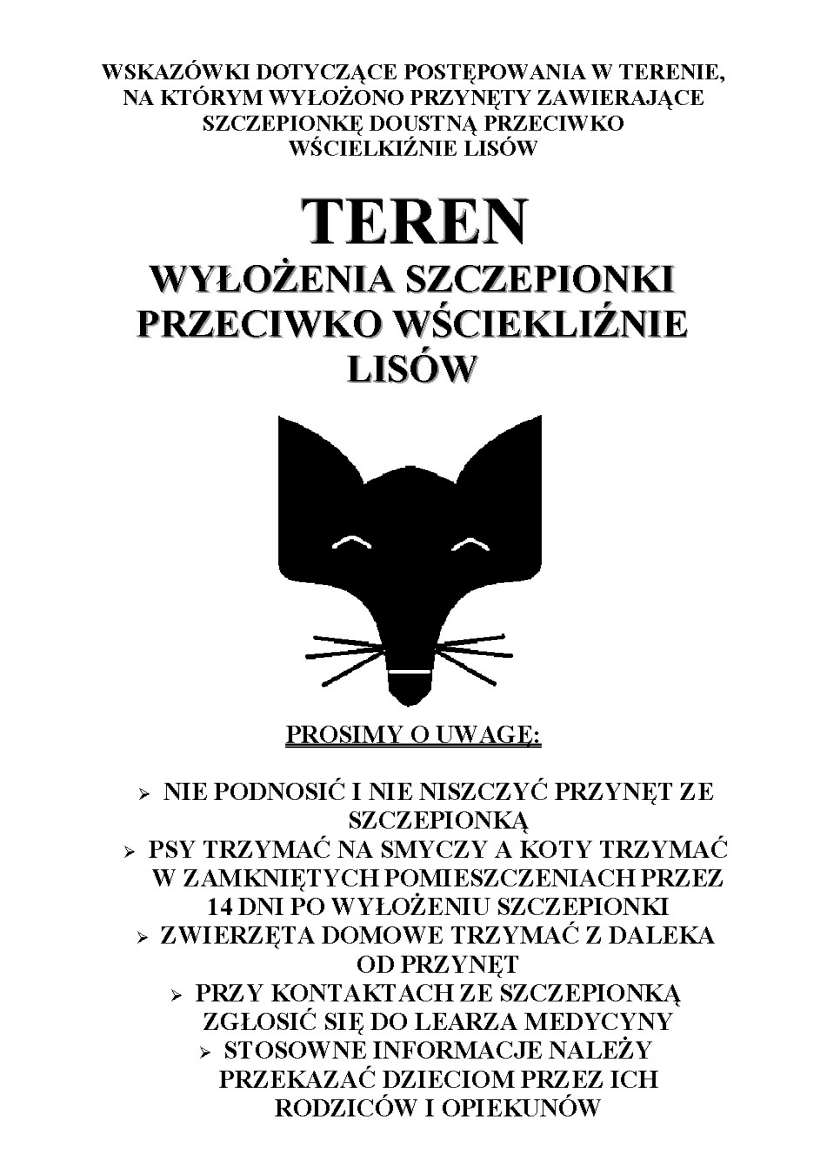 Rozporządzenie nr 36 Wojewody Mazowieckiego z dnia 7 września 2021r. zmieniające rozporządzenie w sprawie zwalczania wścieklizny całego powiatu wołomińskiego jako obszaru zagrożonego wścieklizną weszło życie. Poniżej zamieszczamy skan rozporządzenia oraz wskazówki postępowania w terenie, na którym wyłożono przynęty ze szczepionką doustną przeciwko wściekliźnie lisów.