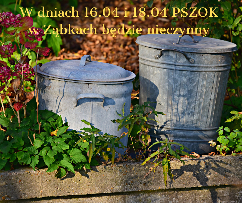 Drodzy Mieszkańcy, w piątek dnia 15 kwietnia, PSZOK w Ząbkach będzie przyjmował odpady w godzinach od 8:00 do 15:00 W sobotę, 16 kwietnia oraz poniedziałek 18 kwietnia w związku z przerwą świąteczną PSZOK będzie nieczynny.