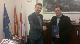 Burmistrz Robert Perkowski i prezes firmy Paweł Całka złożyli podpisy na dokumencie w obecności Zastępcy Burmistrza Artura Murawskiego oraz kierownika Referatu