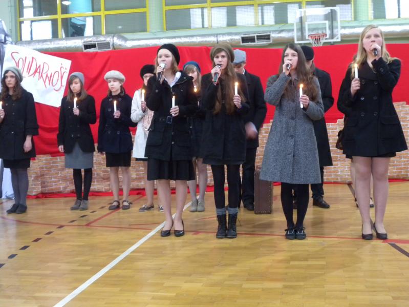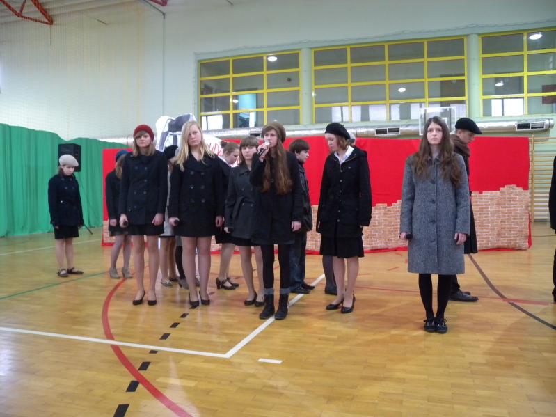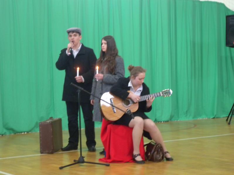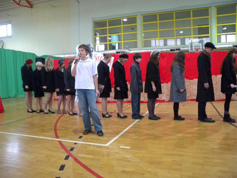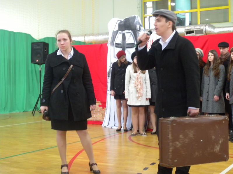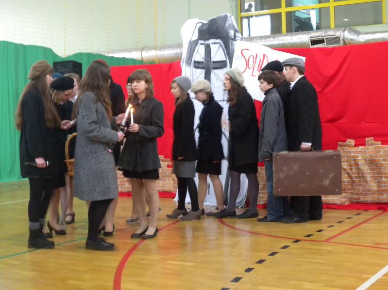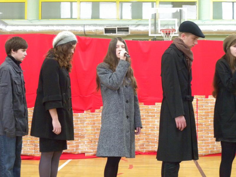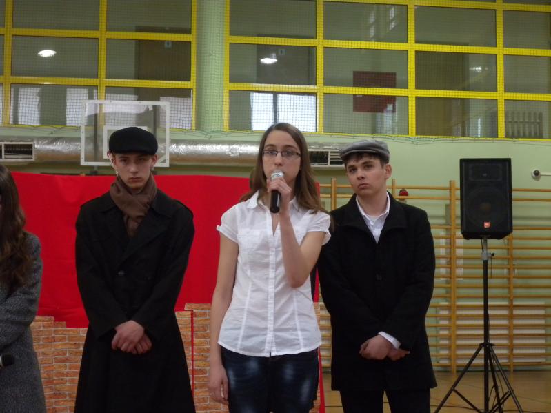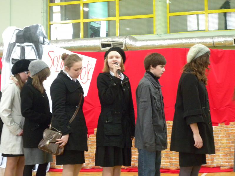 Młodzież z koła teatralnego w Miejskim Ośrodku Kultury w Ząbkach, wraz z zespołem "Forte" i uczniami z PG2 w pięknym stylu wykonała tematyczny montaż słowno –