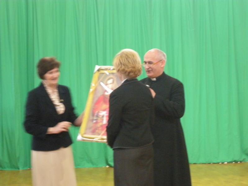 Następnie ks. proboszcz Tadeusz Bożełko wraz z Katarzyną Soborak wręczyli dyrektor gimnazjum Małgorzacie Zyśk pamiątkowy obraz z wizerunkiem księdza Jerzego.