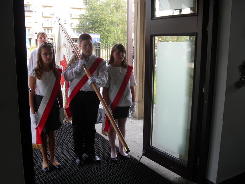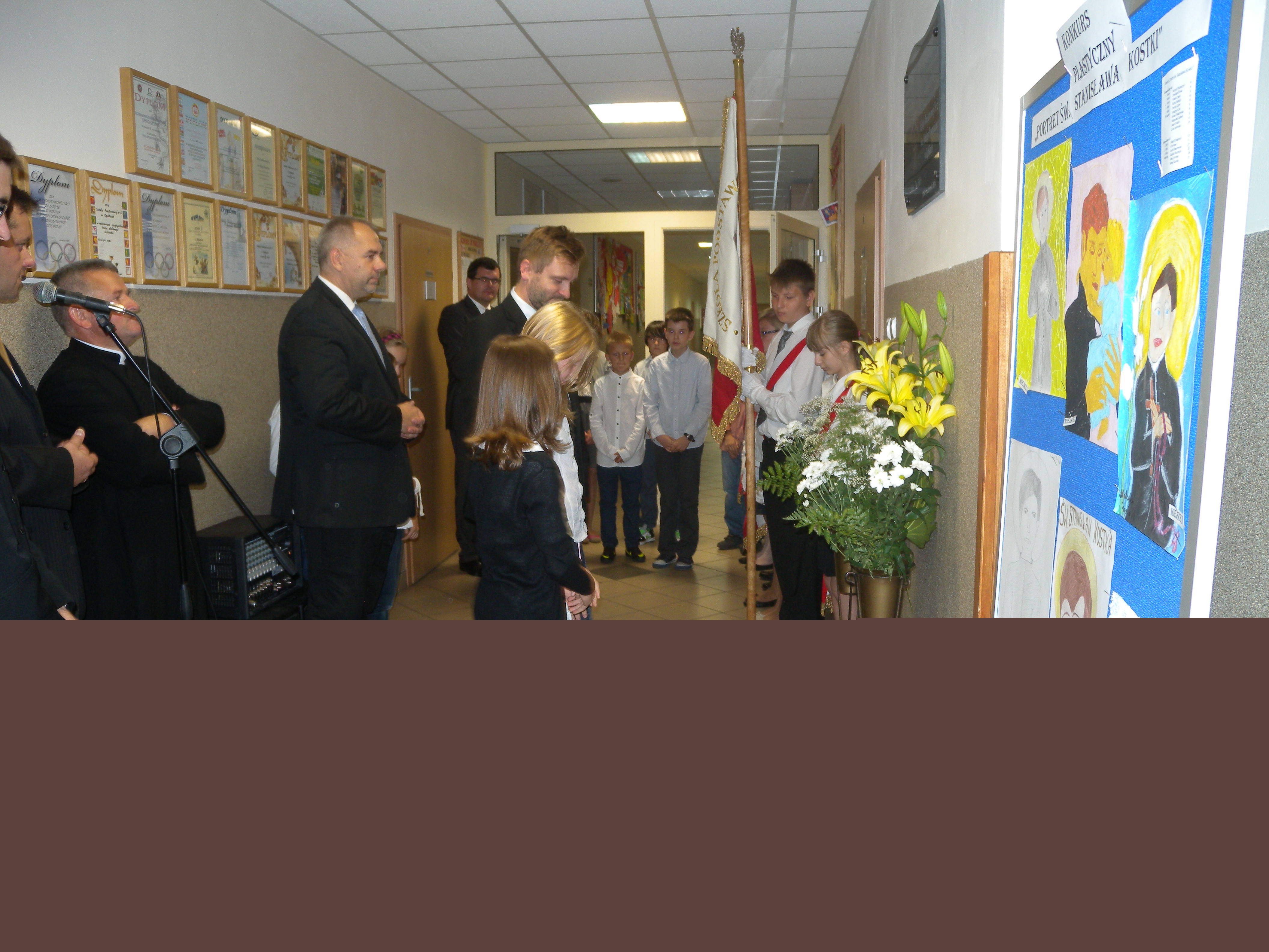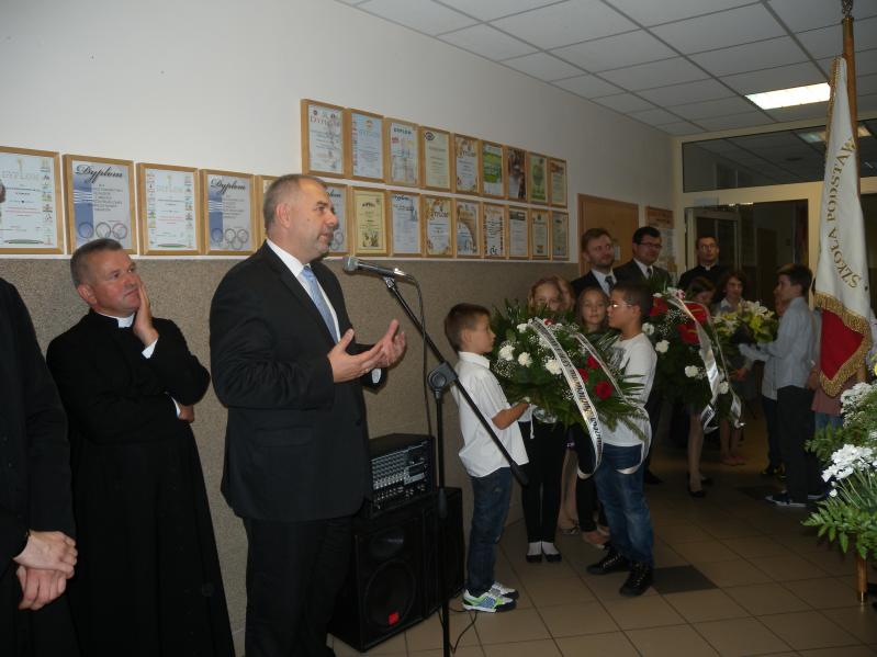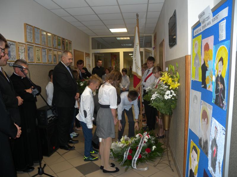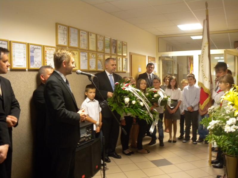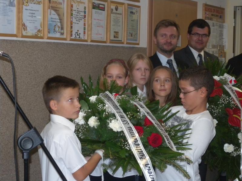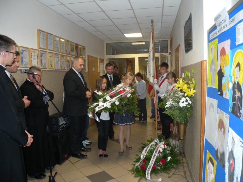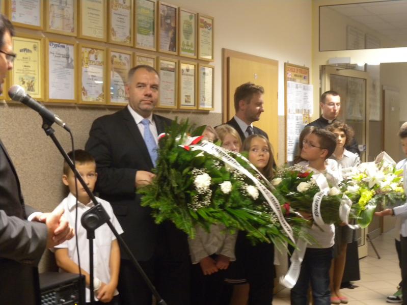 Po obejrzeniu prezentacji nastąpiło wspólne przejście z kaplicy do pobliskiej SP nr 3, gdzie pod tablicą pamiątkową kwiaty złożyli poseł, starosta i burmistrz, którzy