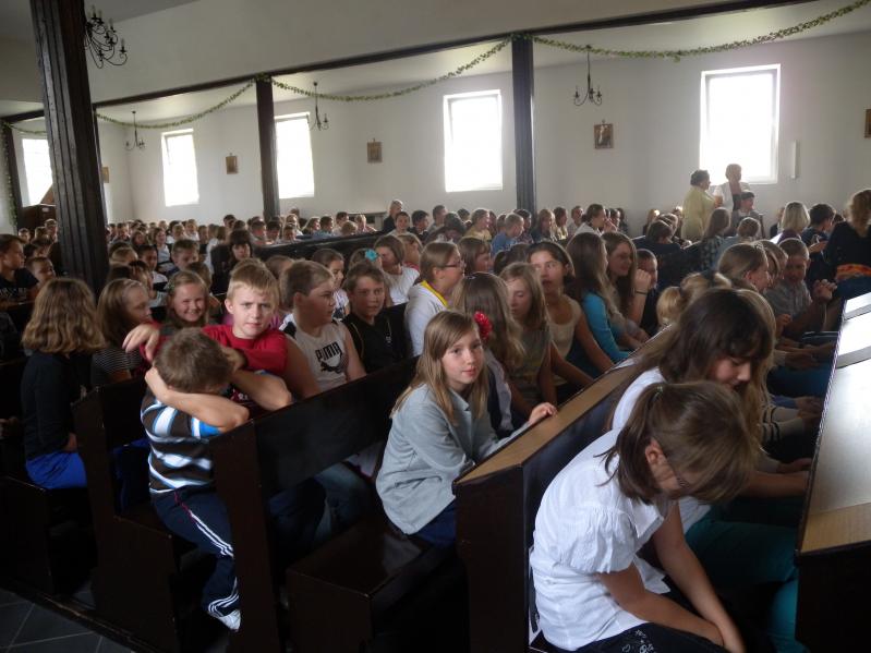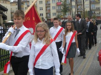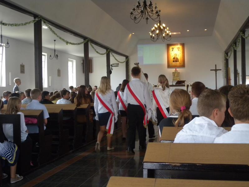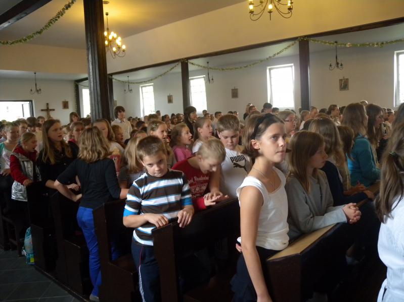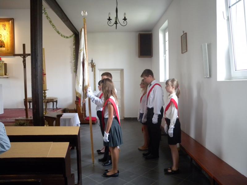 zgromadzonych uczniów, wśród nich - poczet sztandarowy. Proboszcz powiedział, że cieszy się, iż szkoła ma takiego patrona jak św Stanisław Kostka, który całe swoje