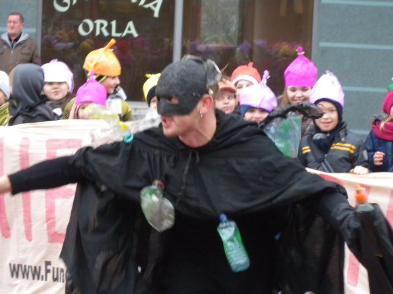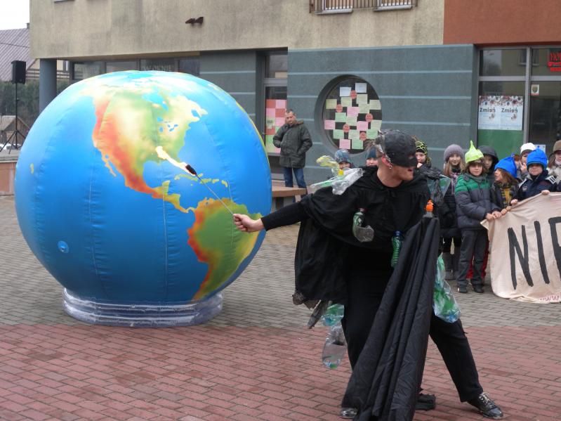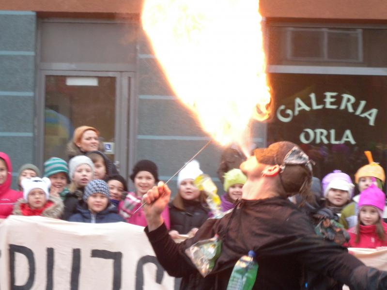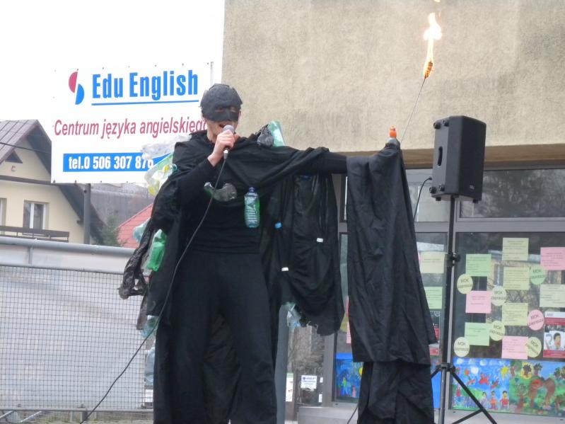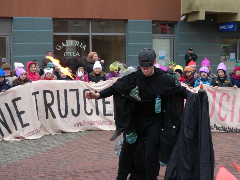 na plac przy pasażu Orla , gdzie o godz. 12.00 rozpoczął się uliczny spektakl. Główną rolę zagrała okropna dioksyna, jaka powstaje podczas spalania śmieci. Dzieci z