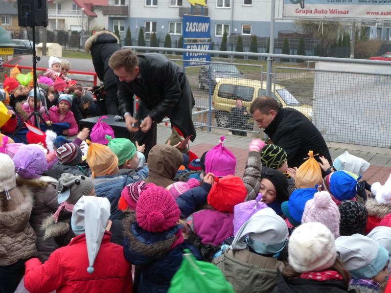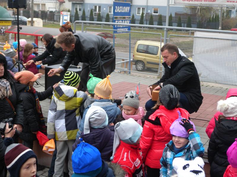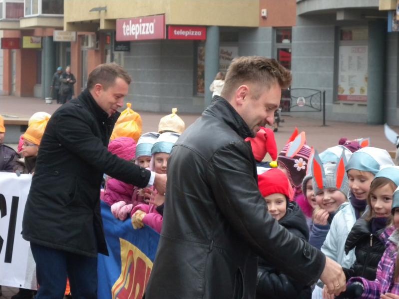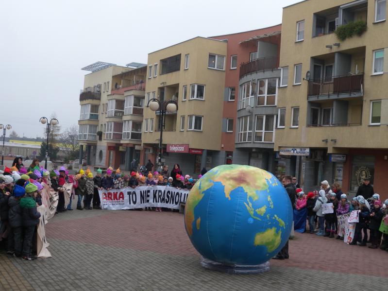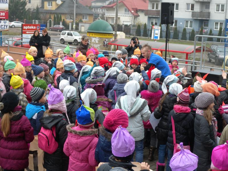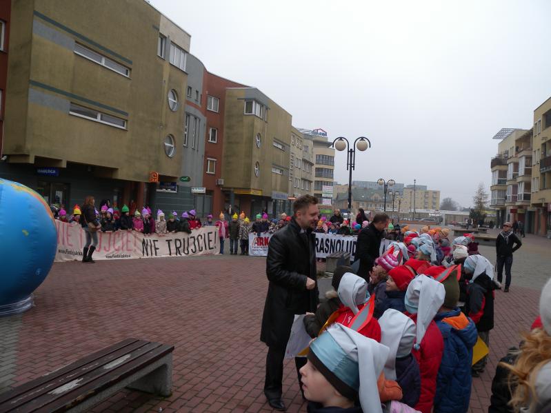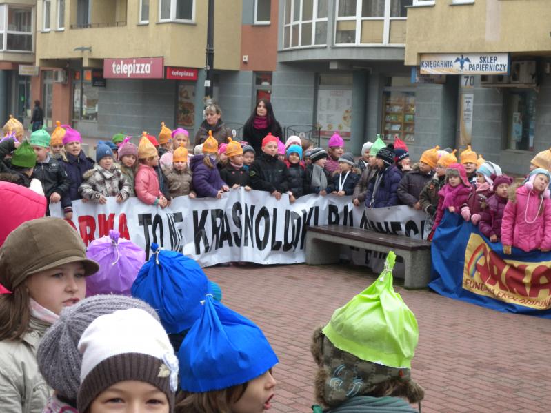 udział wychowawcy oraz uczniowie klas , przebrani za krasnoludki w rękach trzymając transparenty, eskortowani prze Straż Miejską .Punktem kulminacyjnym było dotarcie