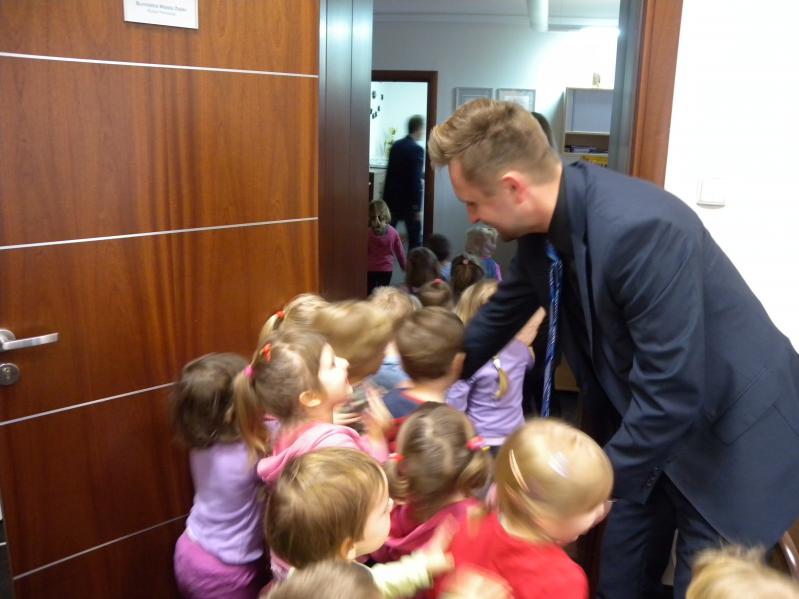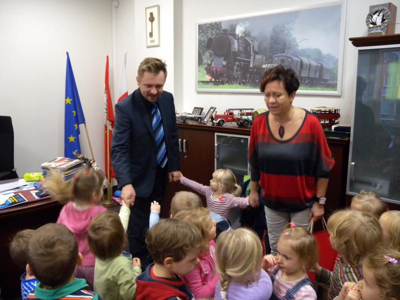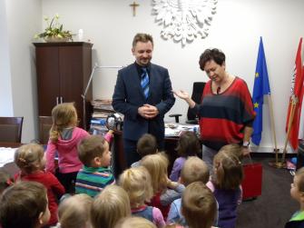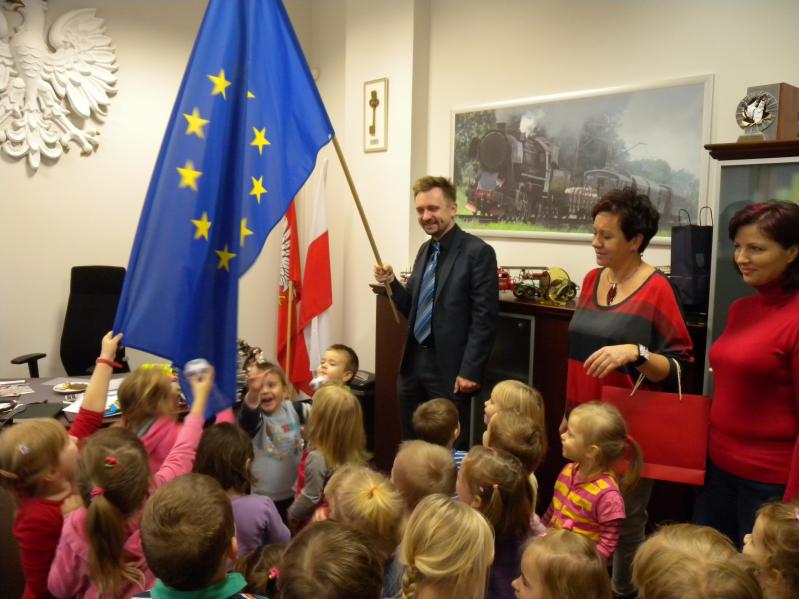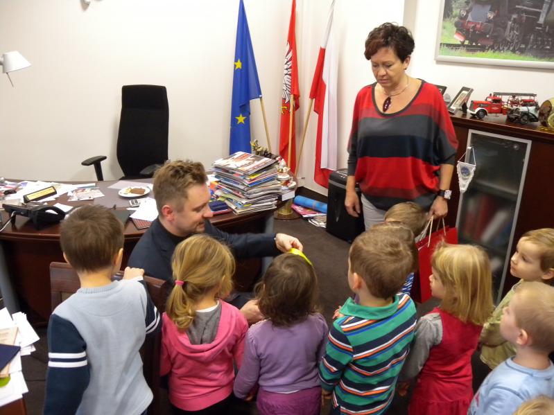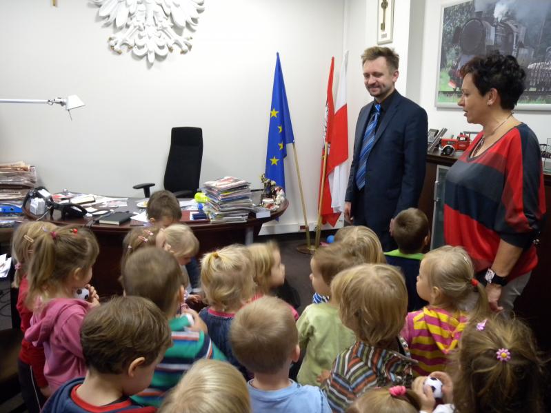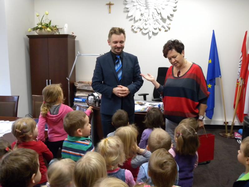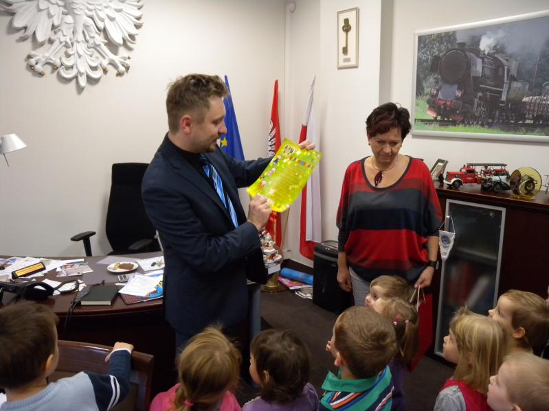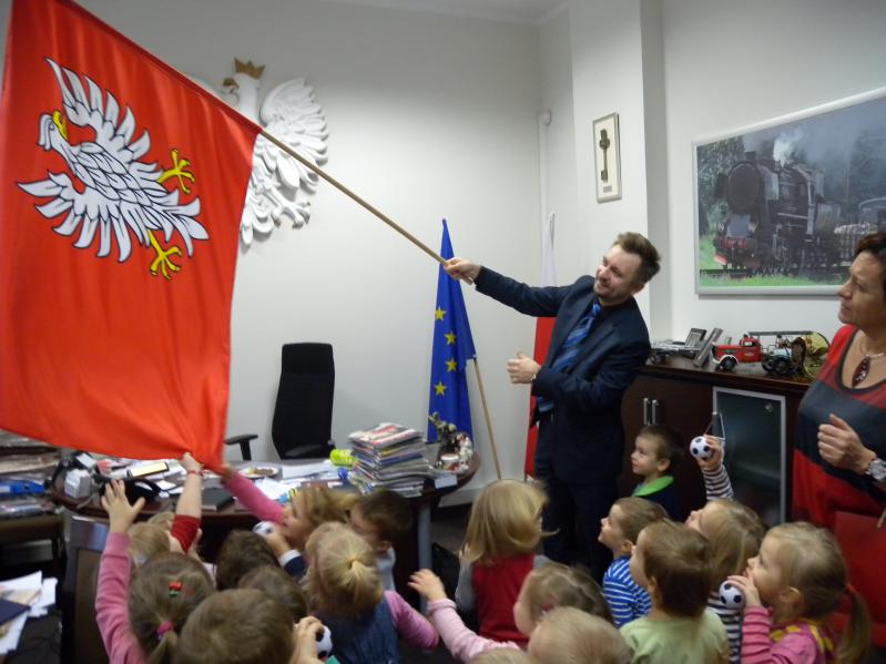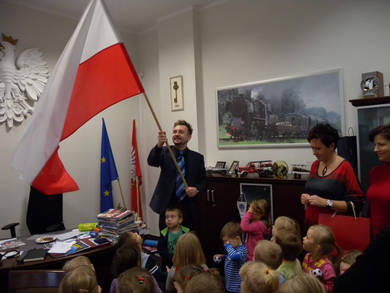 Już o godzinie 9.30 dzieci odwiedziły Roberta Perkowskiego burmistrza miasta. Tutaj po osobistych powitaniach, burmistrz zaprezentował dzieciom flagi: Polski, Unii
