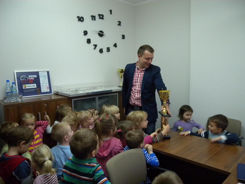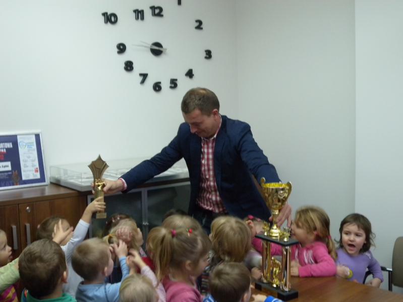 maluchy obejrzały sportowe trofea: statuetki i puchary. Dla chętnych było specjalne zadanie. Można było ze statuetką podniesioną w ręku wysoko do góry krzyczeć: jestem