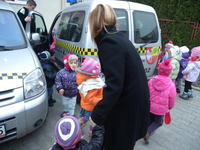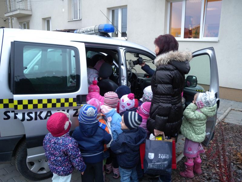 przedszkolaki obejrzały sporą kolekcję emblematów Straży Miejskiej z całej Polski oraz mundur strażnika. Największą atrakcją był jednak samochód Straży Miejskiej z