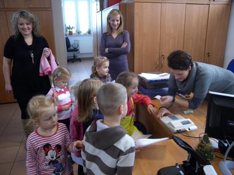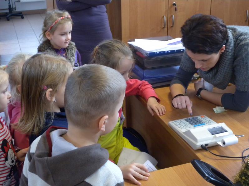 na kalkulatorze księgowym a ze skarbnik Elżbietą Żmijewską pieczętowały na kartkach ważnymi urzędowymi pieczątkami. Dzieci odwiedziły straż miejską, gdzie obejrzały