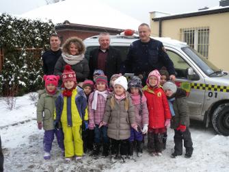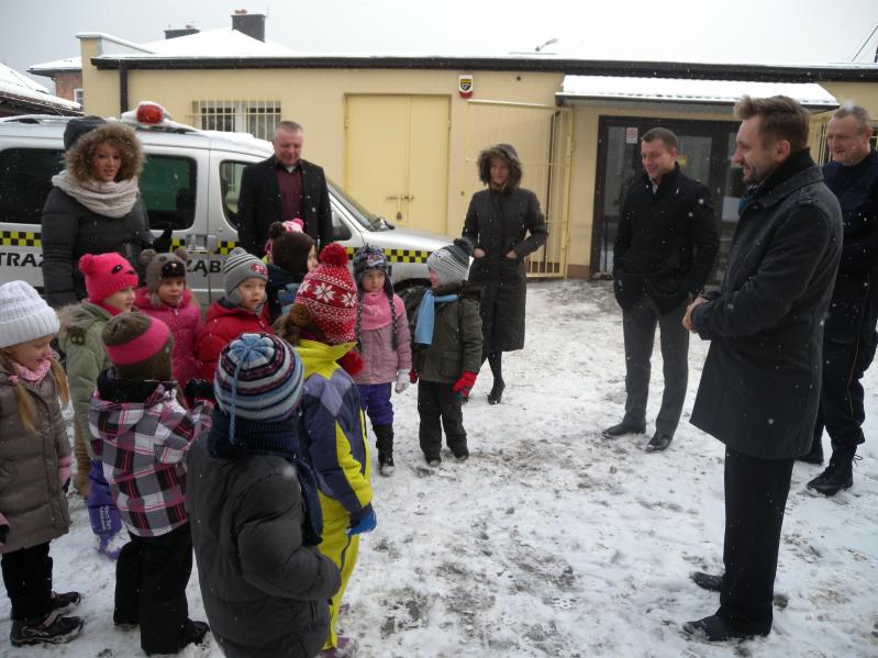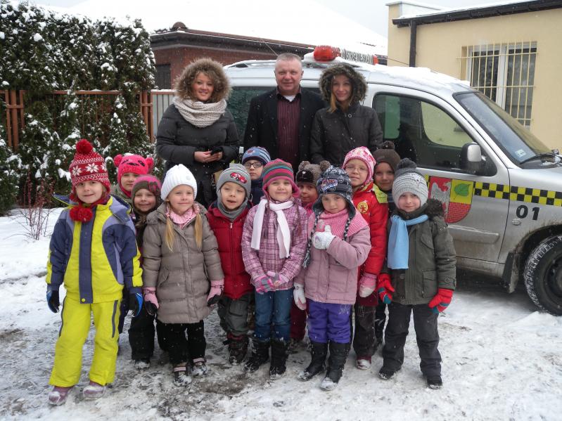 radiowóz z włączonymi kogutami. Sporą atrakcją była możliwość wejścia do auta i mówienia przez megafon. Potem były zdjęcia pamiątkowe z komendantem straży Zbigniewem