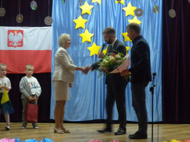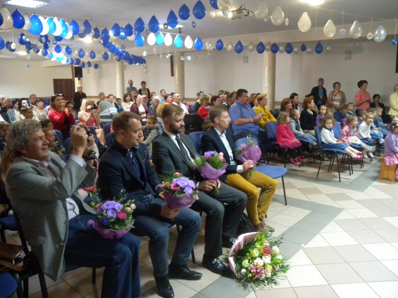 Na uroczystość przybyli zaproszeni goście: burmistrz Robert Perkowski, zastępca burmistrza Artur Murawski, prezes stowarzyszenia Przyjaciół Szkół i Placówek Edukacyjno