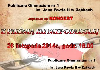 Publiczne Gimnazjum nr 1 im. Jana Pawła II w Ząbkach zaprasza na KONCERT "Z PIEŚNIĄ KU NIEPODLEGŁEJ"