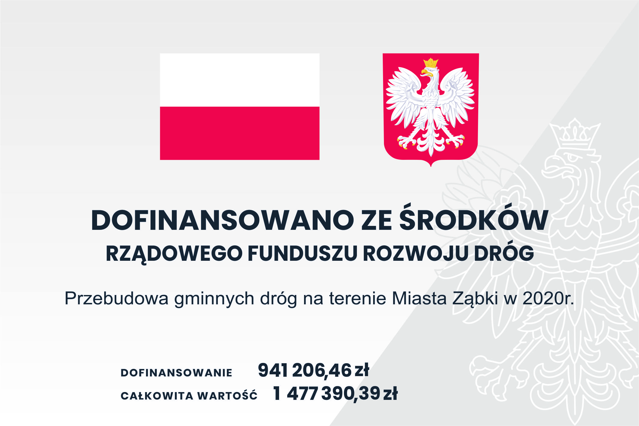 Miasto Ząbki otrzymało w 2020 r. dofinansowanie w wysokości 941.206,46 PLN z państwowego funduszu celowego w ramach Rządowego Funduszu Rozwoju Dróg tj. 65% wartości kosztów kwalifikowanych na następujące zadanie inwestycyjne: